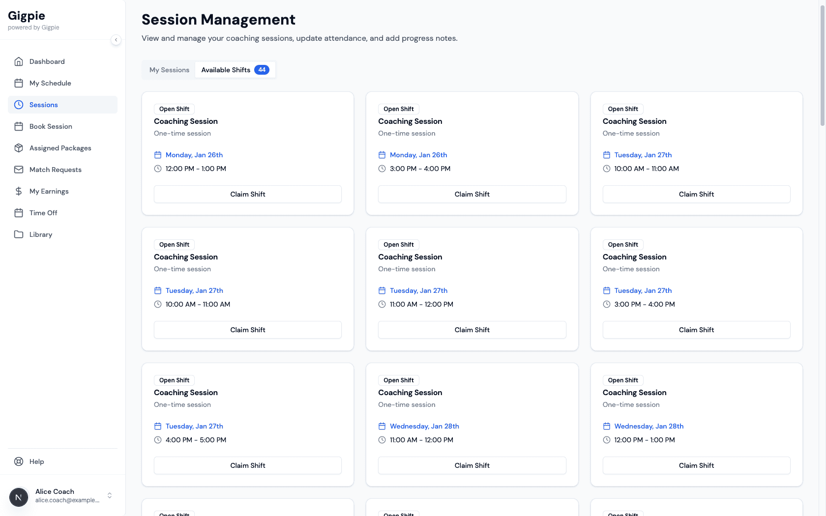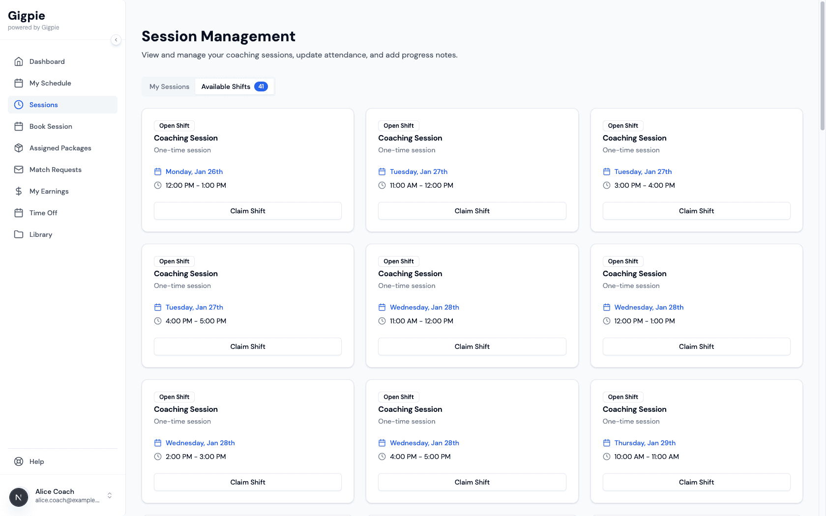 The marketplace shows available sessions that need coaches. When families schedule sessions but don't have an assigned coach, or when another coach requests time off, those shifts become available for you to claim. This is a great way to increase your hours and work with new students.