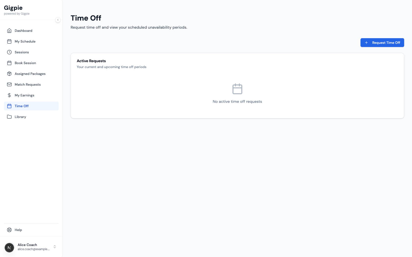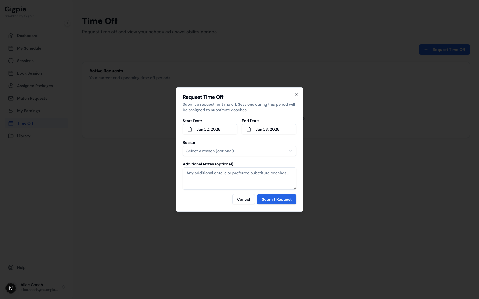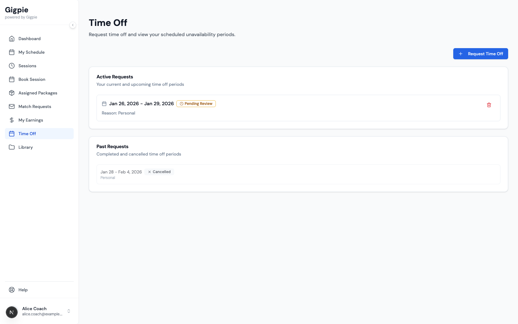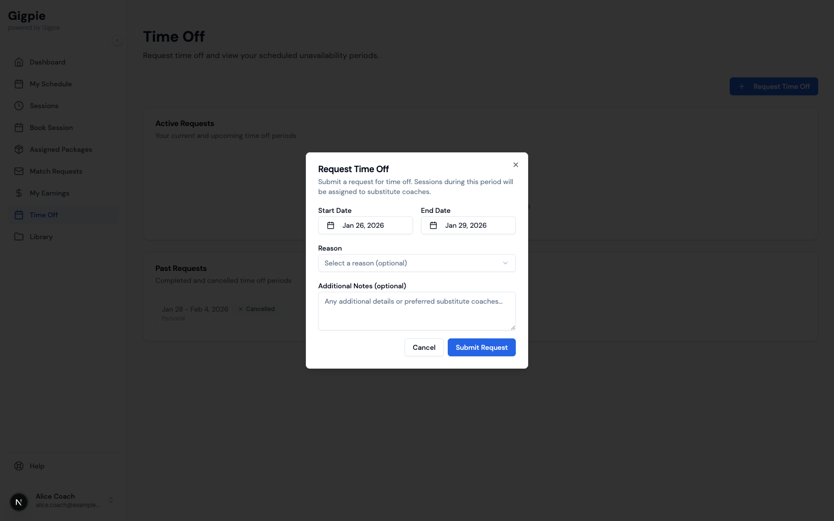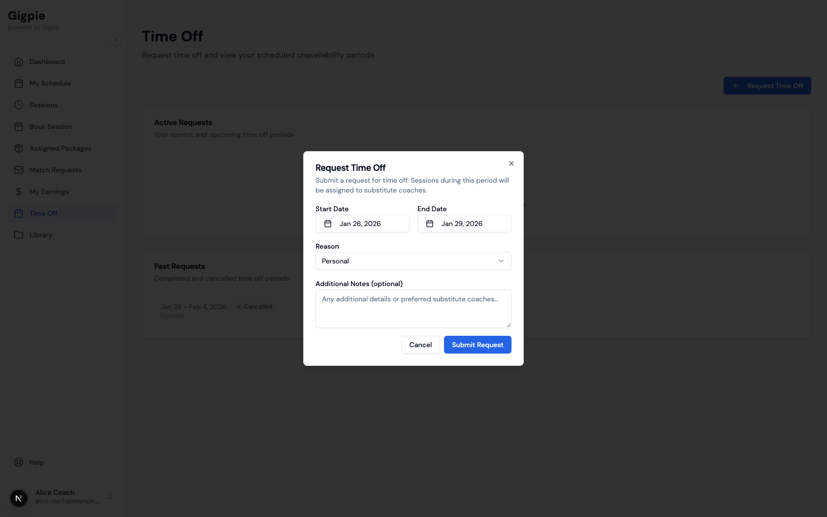 When you need time off for vacation, illness, or personal reasons, submit a time off request through the platform. This notifies your administrator and prevents new sessions from being scheduled during your unavailable period. Submit requests as far in advance as possible to give your admin time to find coverage.