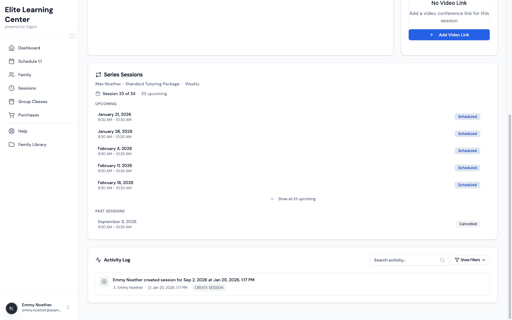 The family sessions page shows all upcoming sessions for every student in your household. This central view helps you stay organized when managing multiple students or multiple subjects. You can see what's coming up, join sessions when it's time, and take action on individual appointments.